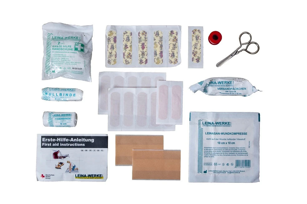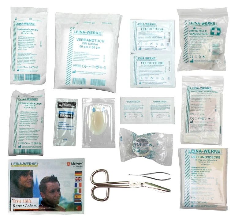 - Inhalt: Heftpflaster 5 x 2,5 cm, 4 Verbandpäckchen, Rettungsdecke gold/silber 210 x 160 cm, 2 Verbandtuch BR, 1 Verbandtuch A, 1 Blasenpflaster 5,5 cm x 3,7 cm, 2 Dreiecktuch, 5 Mullbinden, 1 Schere, 4 Paar Einmalhandschuhe, 1 Pinzette, 1 Sachet Burn Jel 4g, 6 Kompressen 10 x 10 cm, 2 Alkoholtupfer,8 Wundschnellverband 10 x 6 cm, 1 Erste Hilfe Broschüre
