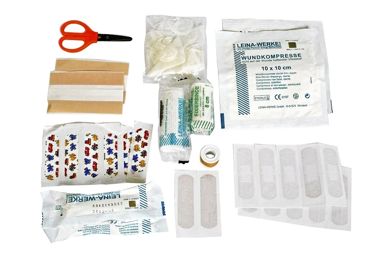 - Inhalt: Kompressen,Kinderpflaster, Pflasterstripes, Schere, Handschuhe, Heftpflaster, Verbandpäkchen, Wundpflaster, Mullbinde, elastische Binde